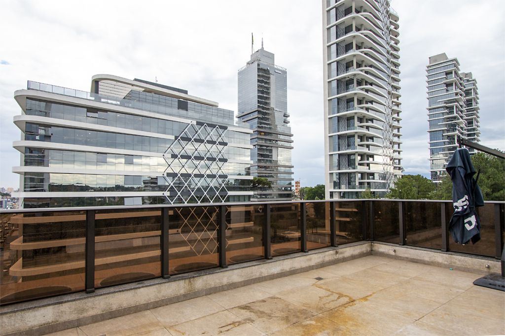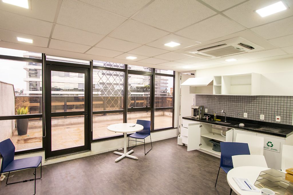 Aluga-se andar inteiro, mobiliado, 469,68m² de área privativa: 07 salas UNIFICADAS com 54 posições de trabalho mobiliadas em espaço aberto, sala diretor 3.97 X 4.60 mobiliada, antessala 6.64 x 3.85 com mesa redonda, sala reunião 6.60 x 4.64 mobiliada, sala reunião menor 4.58 x 4.00 mobiliada e 02 cabines à prova de som; 02 varandas; 08 BWCs; Cozinha mobiliada; ar-condicionado; piso elevado; 07 vagas de garagem (sendo 03 vagas duplas exclusivas).