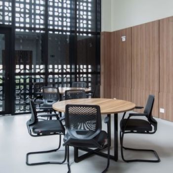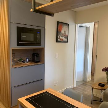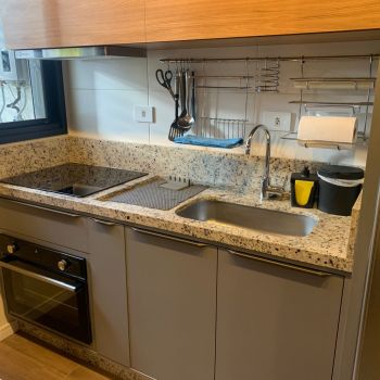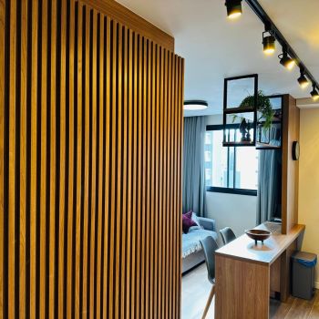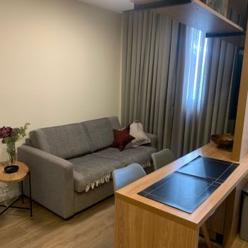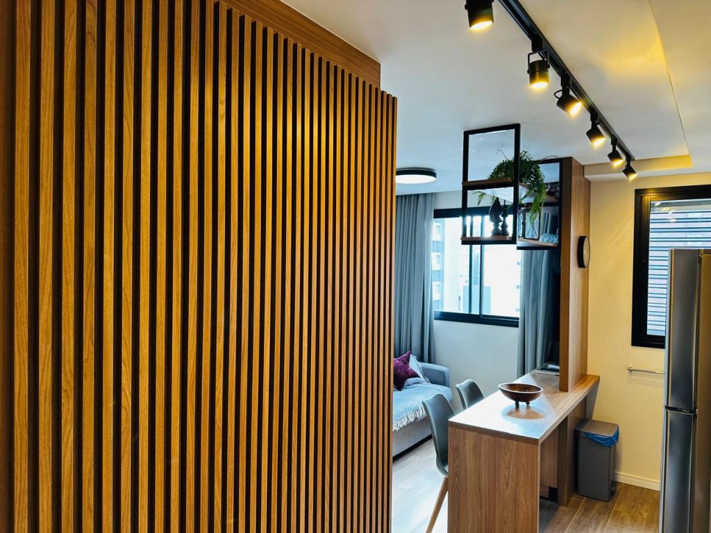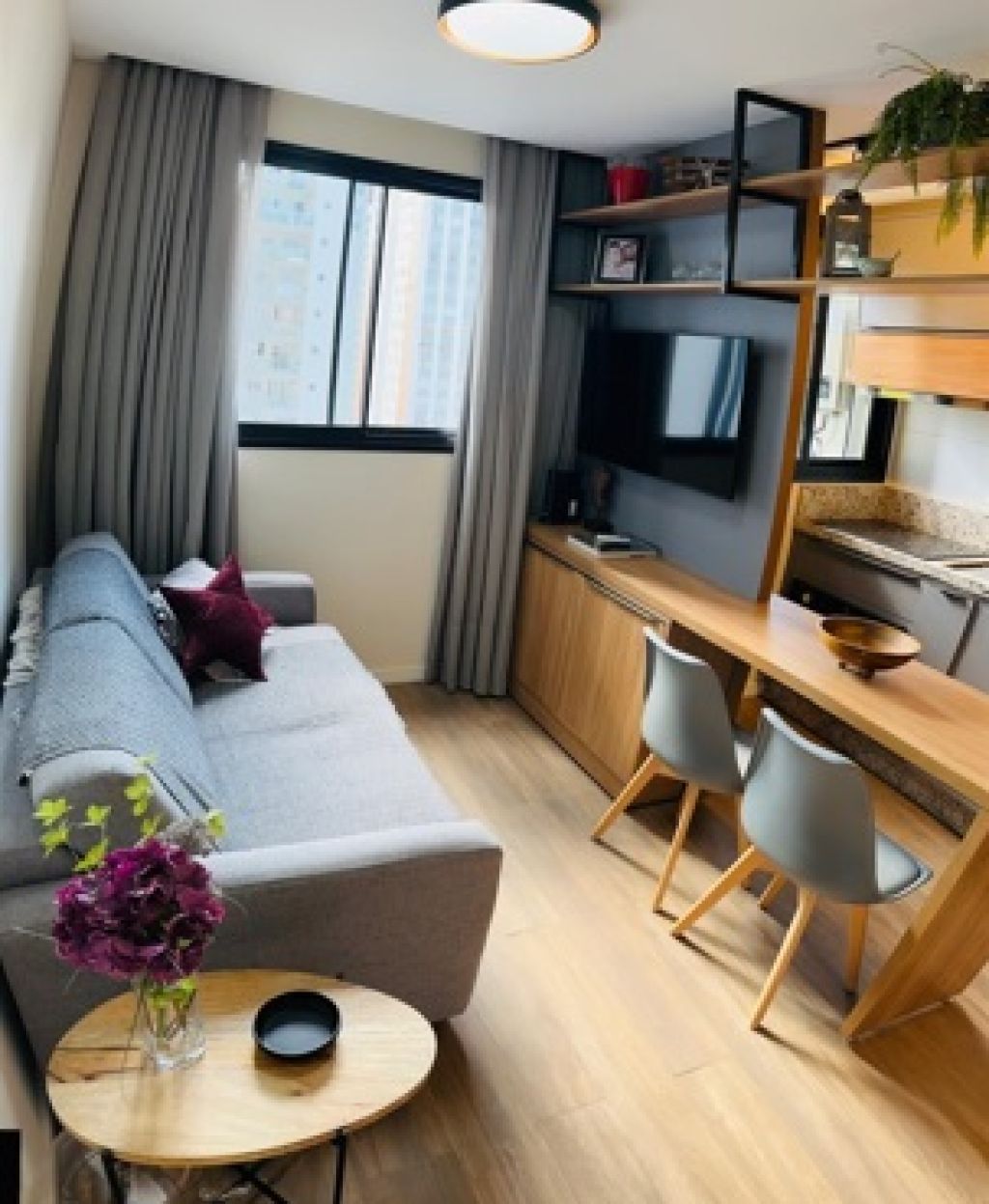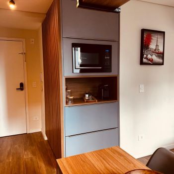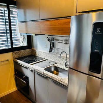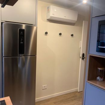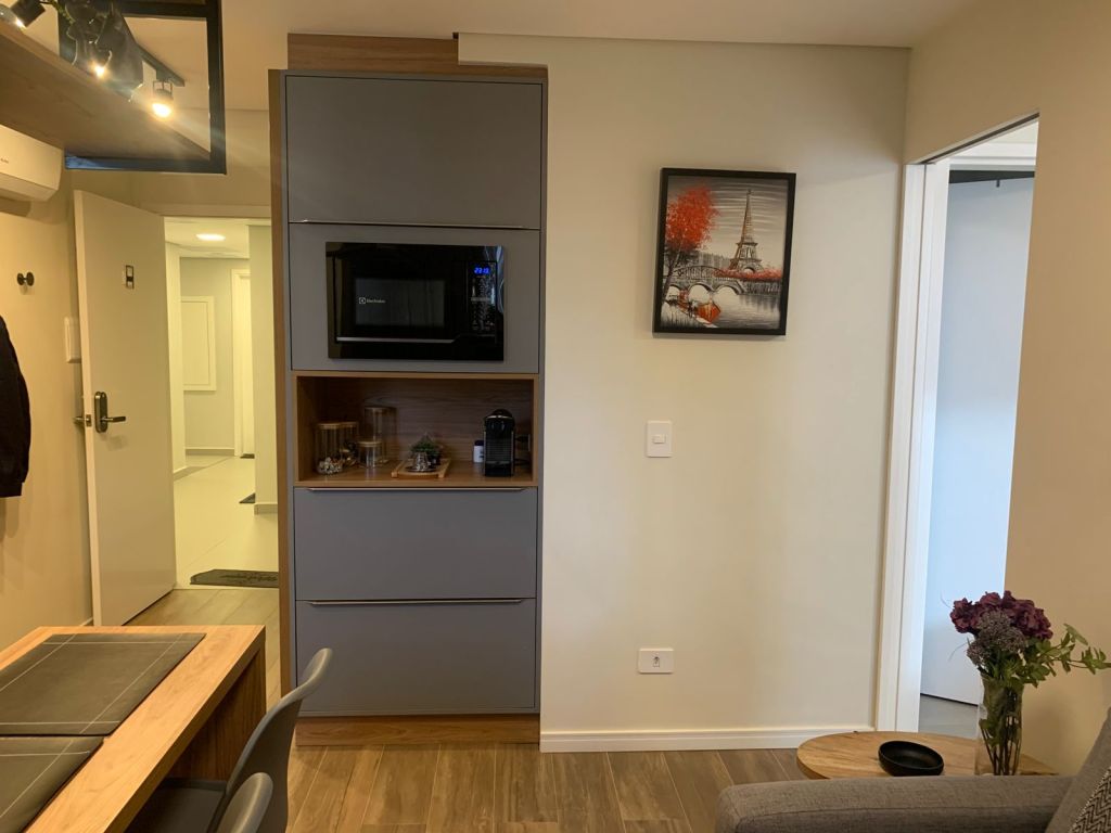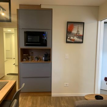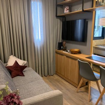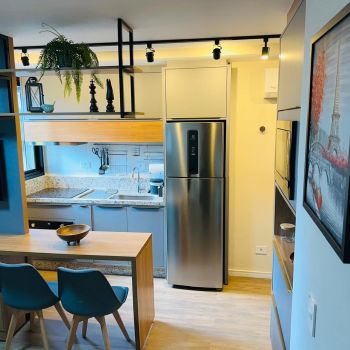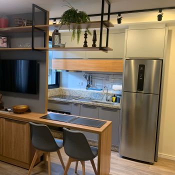 - Sala/Cozinha: móveis planejados, 2 x cadeiras, mesa de apoio, persiana.