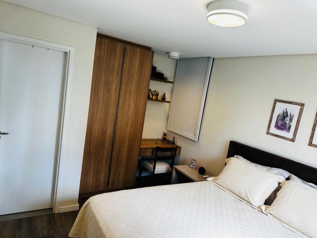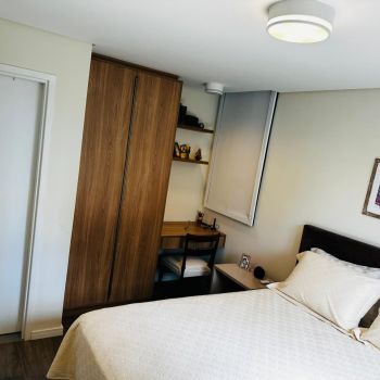- Quarto: móveis planejados, cama baú com colchão, 2 x criado-mudo, cadeira da escrivaninha; persiana;